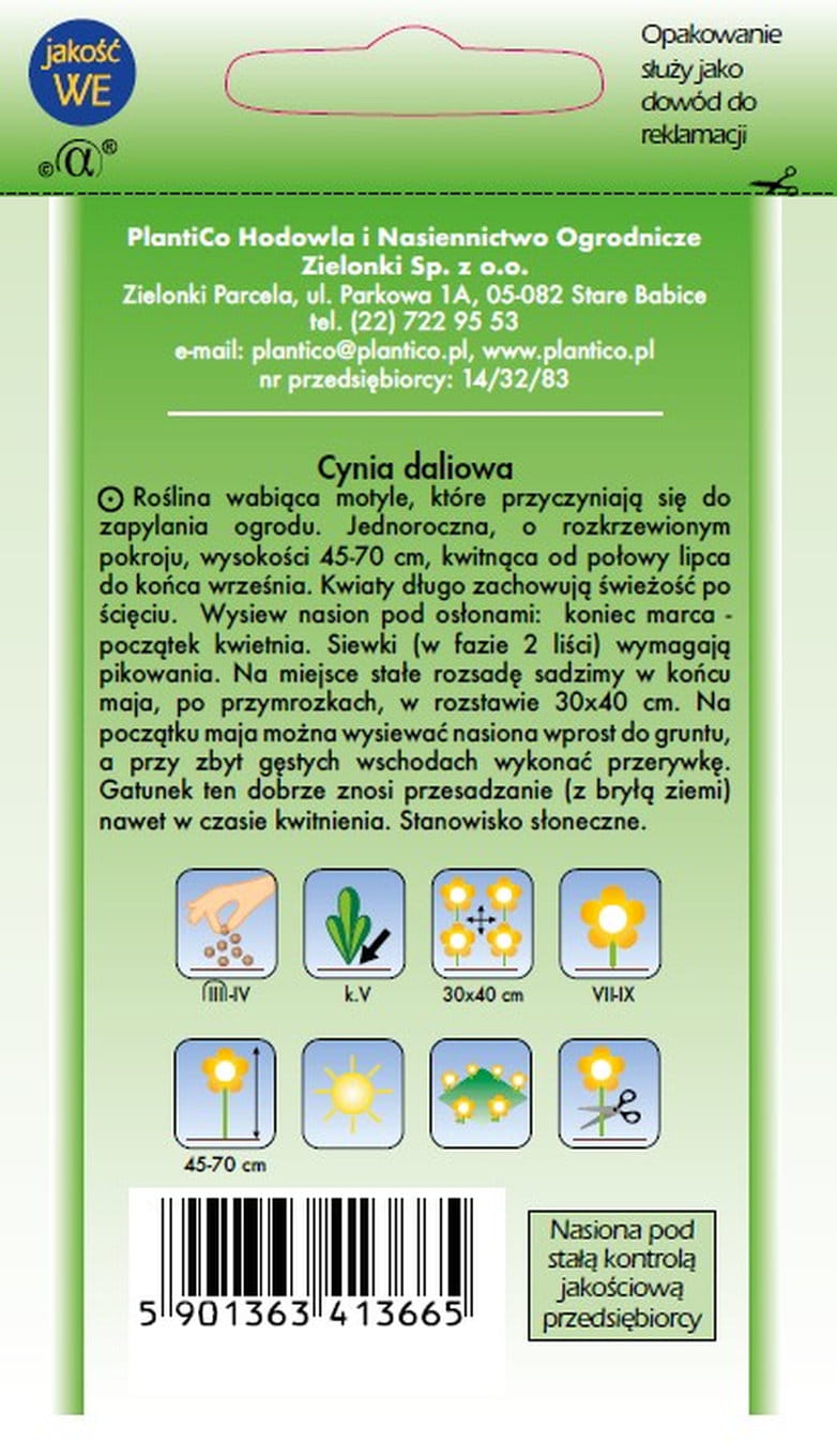 Roślina jednoroczna. Wymaga gleby żyznej, lekkiej, dostatecznie wilgotnej (pH 6,5 7,5). Stanowisko słoneczne. Nasiona wysiewamy do półciepłego inspektu. Optymalna temperatura siewu 18˚C, a po wschodach 14˚C. Siewki, gdy tylko wytworzą pierwszy właściwy liść, pikujemy. Rozsadę na miejsce stałe wysadzamy w trzeciej dekadzie maja. Można też wysiewać nasiona w maju wprost do gruntu, wtedy później kwitnie. Zastosowanie: kwiaty cięte, rabaty, obwódki, kwietniki. Ilość nasion w 1g: 120-200 szt. Gramatura: 1g.