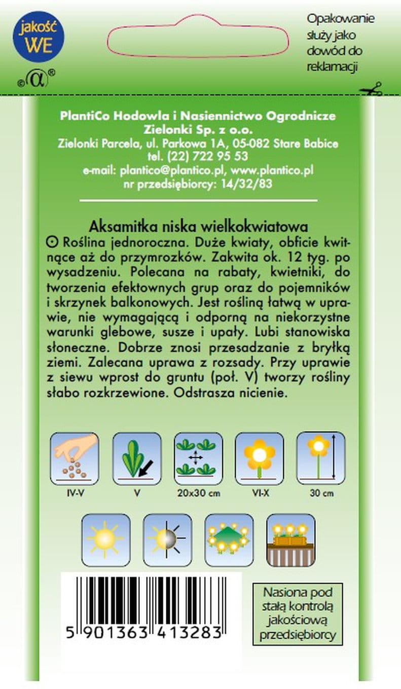 Roślina jednoroczna. Obficie kwitnąca do przymrozków. Wymaga gleby średnio żyznej, próchnicznej. Stanowisko słoneczne lub półcieniste. Nasiona wysiewamy do półciepłego inspektu. Optymalna temperatura kiełkowania 16˚C, a po wschodach 14˚C. Siewki pikujemy w rozstawie 3x5 cm. Rozsadę na miejsce stałe wysadzamy po 15 maja. Nasiona wysiewamy także w maju wprost do gruntu. Odporna jest na susze i upały. Nie toleruje gleb ciężkich, ilastych. Zastosowanie: kwietniki, obwódki, misy, balkony. Ilość nasion w 1g: 300 - 400szt. Gramatura: 1g.