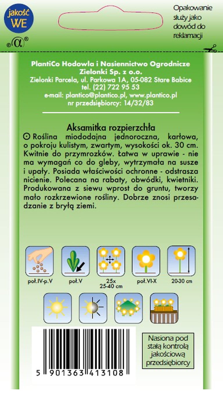 Roślina jednoroczna. Obficie kwitnąca do przymrozków. Wymaga gleby średnio żyznej, próchnicznej. Stanowisko słoneczne lub półcieniste. Nasiona wysiewamy do półciepłego inspektu. Optymalna temperatura kiełkowania 16˚C, a po wschodach 14˚C. Siewki pikujemy w rozstawie 3x5 cm. Rozsadę na miejsce stałe wysadzamy po 15 maja. Nasiona wysiewamy także w maju wprost do gruntu. Odporna jest na susze i upały. Nie toleruje gleb ciężkich, ilastych. Zastosowanie: kwietniki, obwódki, misy, balkony. Ilość nasion w 1g: 300 - 400szt. Gramatura: 1g