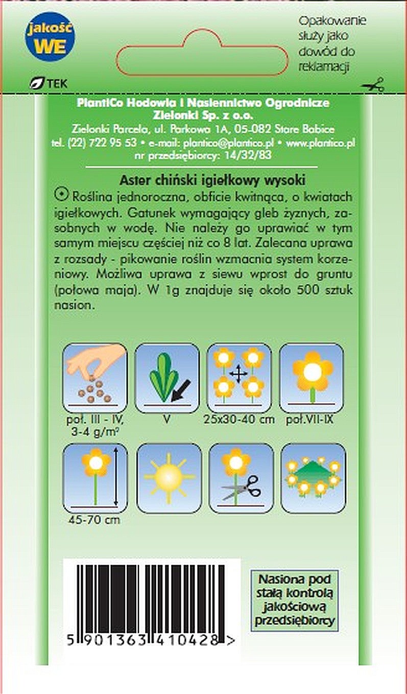 Roślina jednoroczna. Wymaga gleby żyznej o pH 7,0-8,0. Stanowisko słoneczne. Nasiona wysiewamy do półciepłego inspektu lub na rozsadniku. Kiełkują w temperaturze 12˚C po 14 dniach. Siewki pikujemy do zimnego inspektu, gdy mają dwa liście. Rozsadę, wraz z bryłą ziemi, na miejsce stałe sadzimy w maju. Rośliny dobrze znoszą przesadzanie. Zastosowanie: rabaty, kwietniki, misy, skrzynki balkonowe i kwiaty cięte. Ilość nasion w 1g: 450-600 sztuk. Gramatura: 1g.