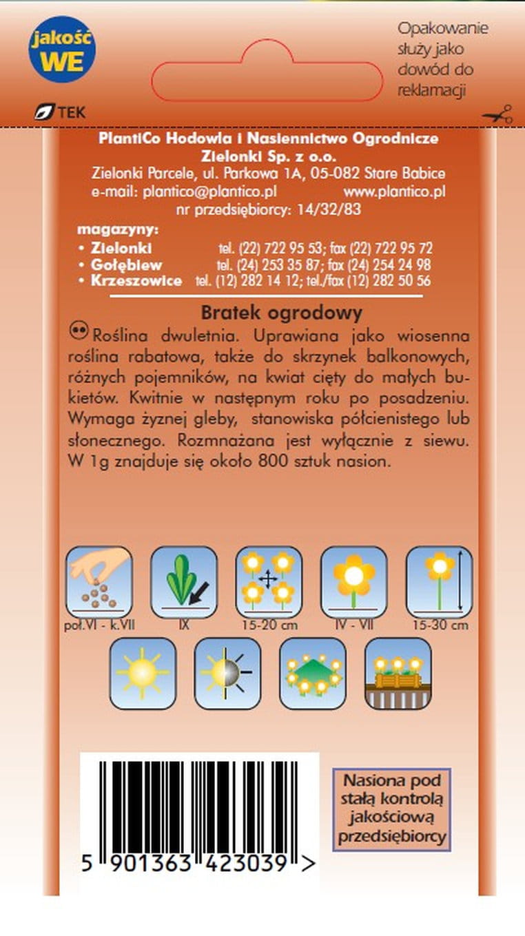 Roślina dwuletnia, uprawiana jako wiosenna roślina rabatowa , do skrzynek balkonowych, różnych pojemników, na kwiat cięty do małych bukietów. Kwitnie w następnym roku po posadzeniu. Wymaga gleby żyznej, stanowiska półcienistego lub słonecznego. Gramatura: 0,5g.