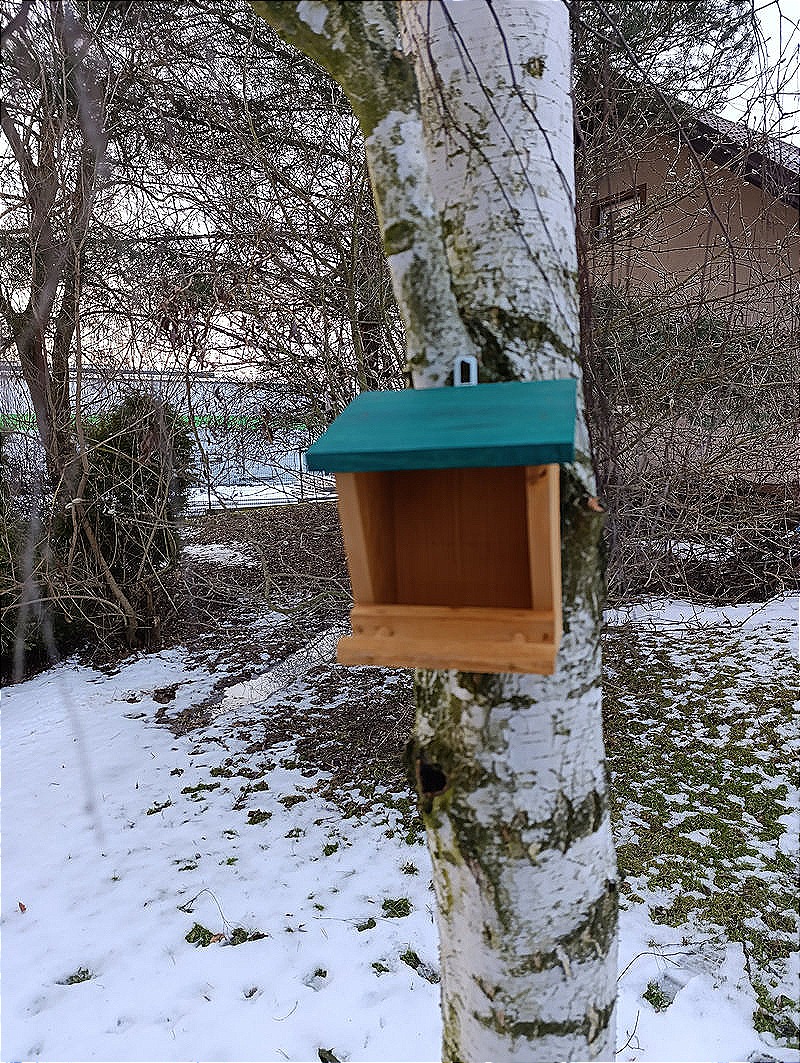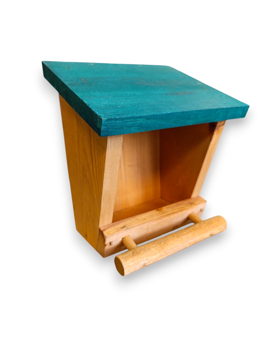 Karmnik mały w kolorze zielono- beżowym – kompaktowy i estetyczny karmnik dla ptaków, wykonany w ciepłym, naturalnym odcieniu dębu. Produkt wykonany w Polsce z naturalnych materiałów. Idealny do ogrodu, na balkon lub taras, zapewnia ptakom bezpieczne miejsce do karmienia i harmonijnie komponuje się z otoczeniem.