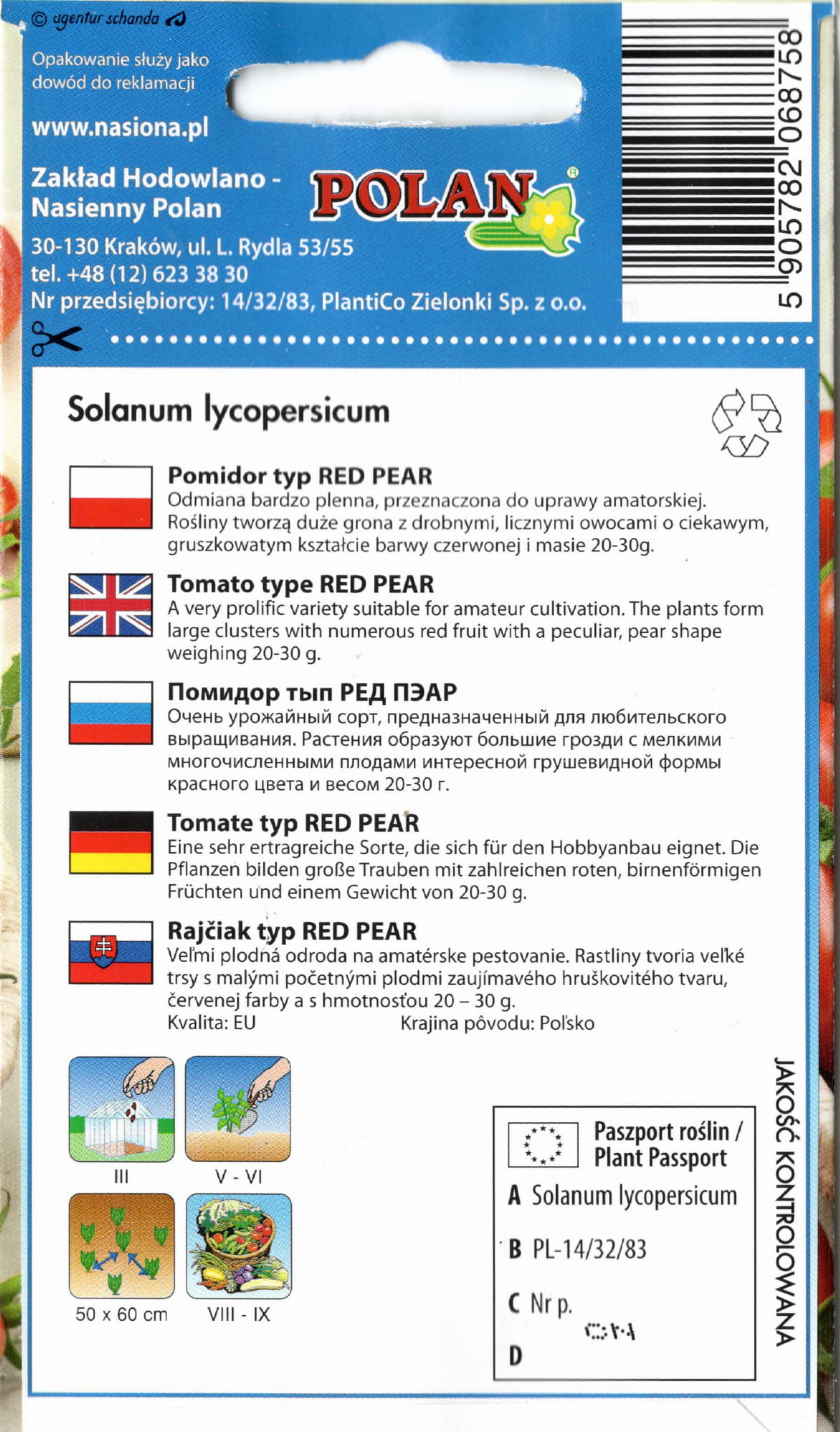 Odmiana plenna, przeznaczona do uprawy amatorskiej. Rośliny o niekończącym wzroście, powyżej 1m wysokości. Tworzą duże grona z drobnymi owocami o wyjątkowym, gruszkowatym kształcie, czerwonej barwie i masie 20-30g. Miąższ soczysty i słodki. Nadaje się do uprawy pod osłonami i w gruncie przy palikach najlepiej na dwa pędy. Gramatura:0,2g.
